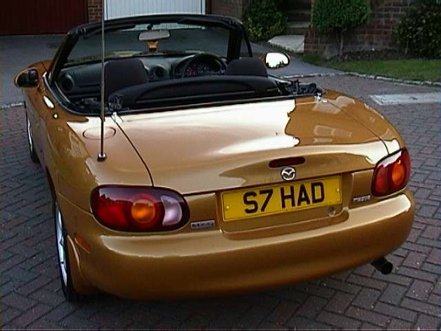 Back to Brian Gubby with the Hyundai, and I was thinking about getting a new car from Europe. An MX-5 was the best bet, but was also interested in a Honda S2000 and Audi TT Roadster. But they weren't out in the UK, and importing from abroad was just as tricky, with delivery in the year 2000. I needed something fast before the whole world knew of the facelift for the Coupe. I went into the showroom to ask how much I'd get if I traded in the Coupe in respect of a new MX-5, and I knew Europe would be much cheaper. Arrgh, lead times from Europe were 5 months. I couldn't wait that long. And all for £2500 savings at best. Taking the dealers MX-5 out for a spin, I noticed it - 2,200 miles on the clock, a 1.8 is in racing bronze. Yes, the Wolves car had arrived! It was owned by a local gent who bought it to drive around on sunny weekends whils he waited for his Mercedes SLK to arrive. Fine, well, his loss - this little beauty with its 0-60 mph in 7.4 seconds was to wind its way to my house - after 'cutting them to the bone' - Brian Gubbys' quote, not mine. I have taken possession of it just a week later (to avoid the carnage of the new V-plate of September 1st). CD player now installed, I have already taken 6 people for a spin on the first day. Oh, just beware if you want to consider stealing it - Its got a CAT 1 Thatcham approved Cobra Alarm and immobiliser which I set off just closing the garage door behind it! Mmmm, pleasant dreams Mexy. Sob Sob, in the end, Sam became preggers with Rebecca and we needed a family car....However, Tim Lloyd from Swindon, a young internet millionaire bought it for his girlfriend. I hadn't had the car that long either...I did manage to put a nice carbon fibre dash on and change the gear knob to a momo carbon one too. However, that gear knob went with me onto my next 2 seater. I wasn't giving up the top down experience that easily, oh no way was I.....